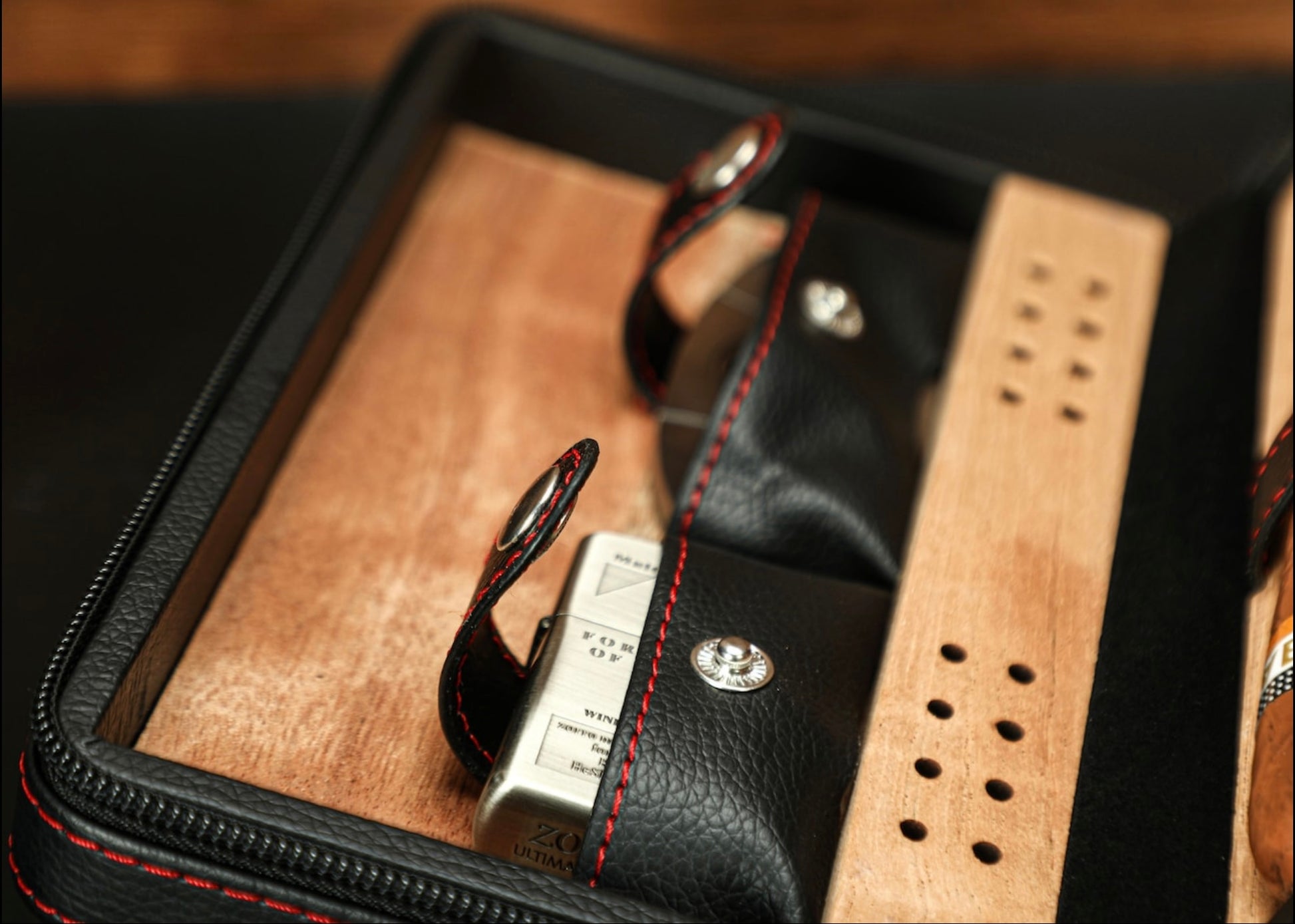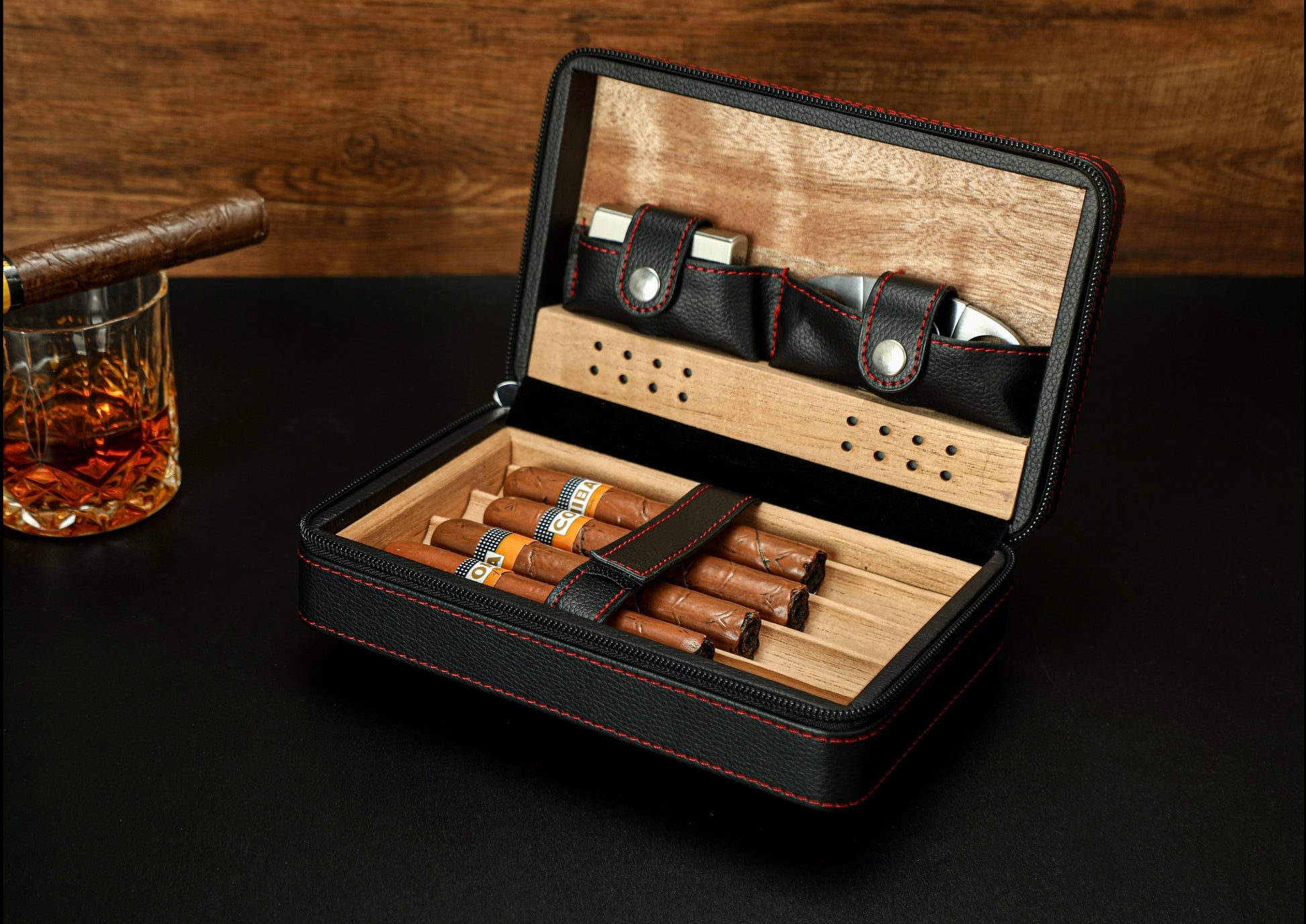 Wrapped in sumptuous black leather and adorned with striking red stitching, it’s a true masterpiece of design. The rich wood interior cradles your prized cigar collection, providing the perfect environment for preserving their flavor and aroma. Each detail, from the precision stitching to the premium woodwork, showcases the dedication to luxury.
